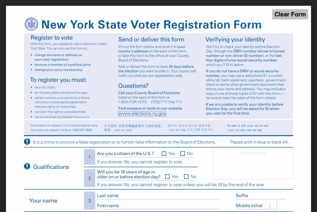 If you do not have the required DMV documentation to register online, or prefer to register by mail, you can fill out the online form. After filling out the form, print it and mail it. This can also be used to make changes to your current registration. The address for your county Board of Elections is provided on the form. If you would like a registration form mailed directly to you instead of using the online form, click here.